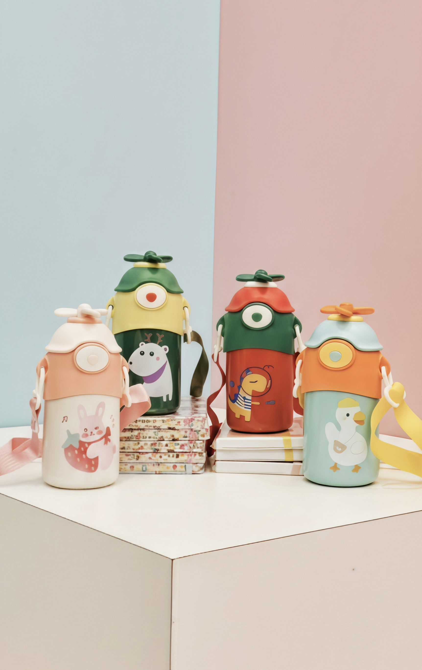 Keep your child's drinks at the perfect temperature with our 550 ml vacuum insulated steel bottles. Features a soft silicone straw, adjustable carry strap, and fun character designs like dinosaurs and bunnies. Durable 304 stainless steel. Price is per piece.