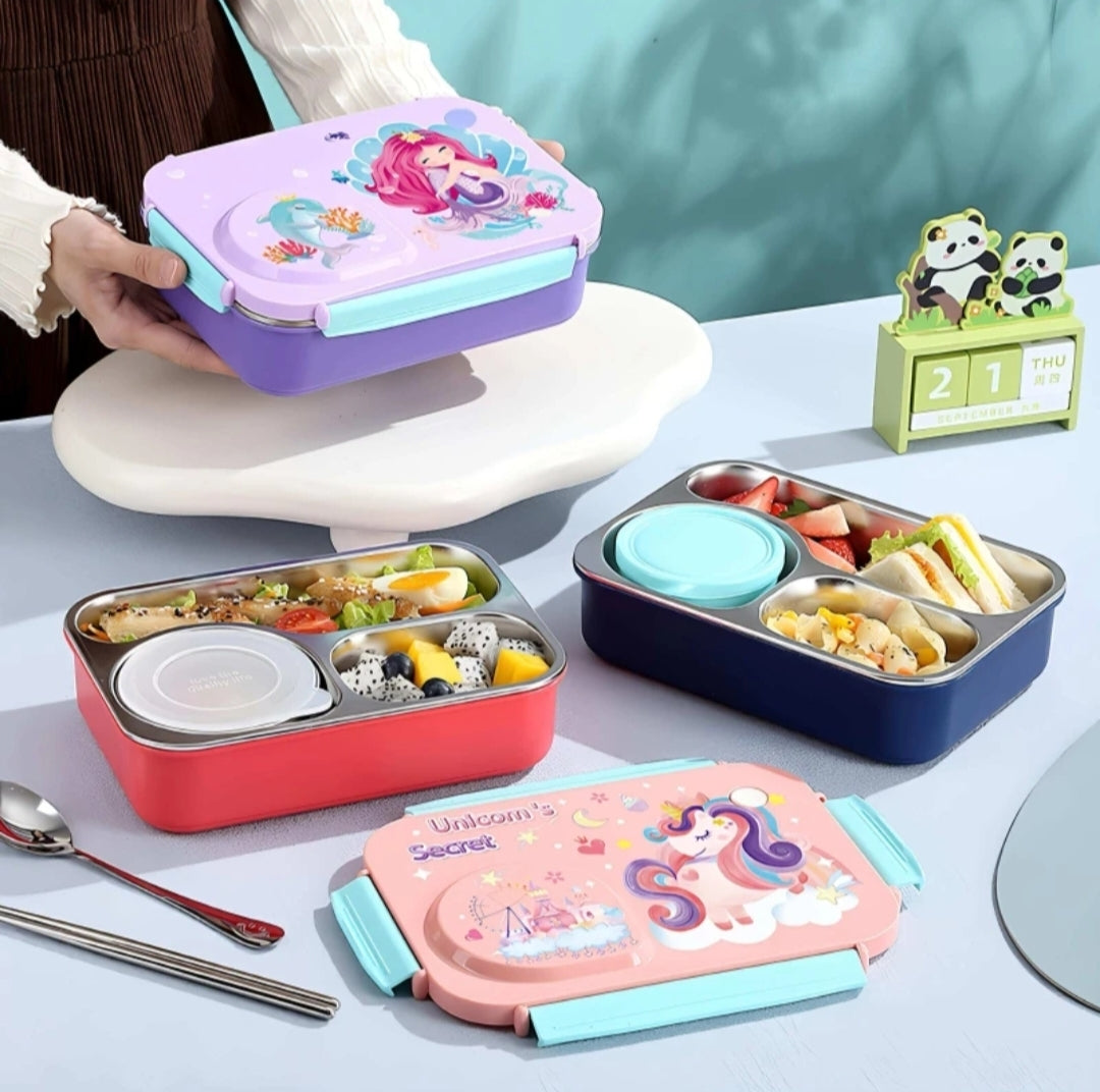 2 layers. Stainless steel tiffin. 3 section tiffin with 1 Bowl with lid. 750 ml + 150 ml capacity. Comes with spoon and chopsticks. Price is per piece.