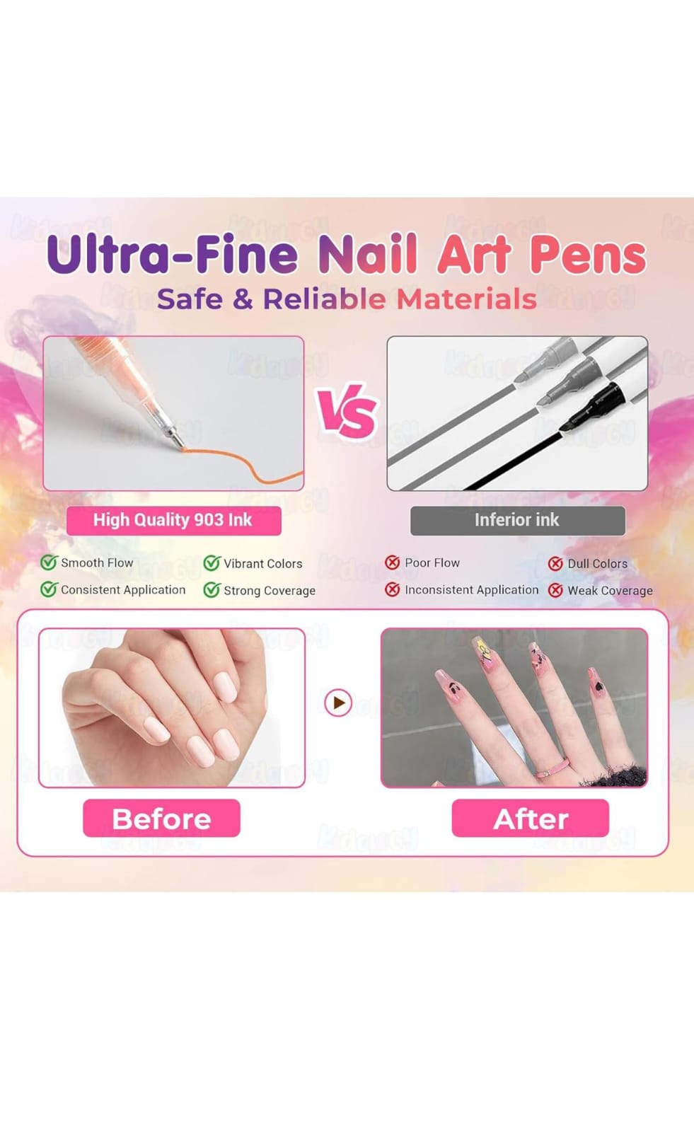Nails art marker set with packaging, markers, and product dimensions on a colorful background.